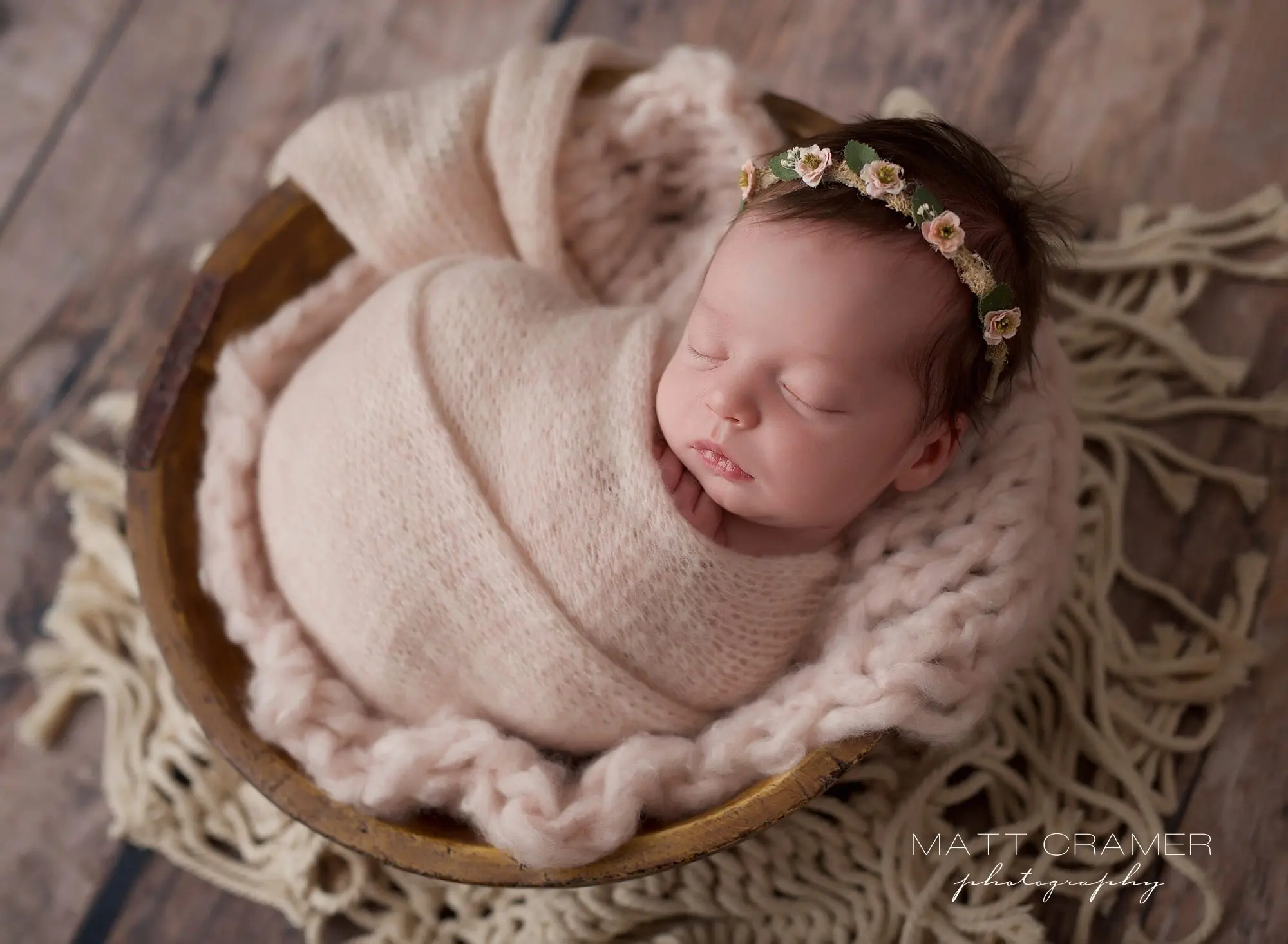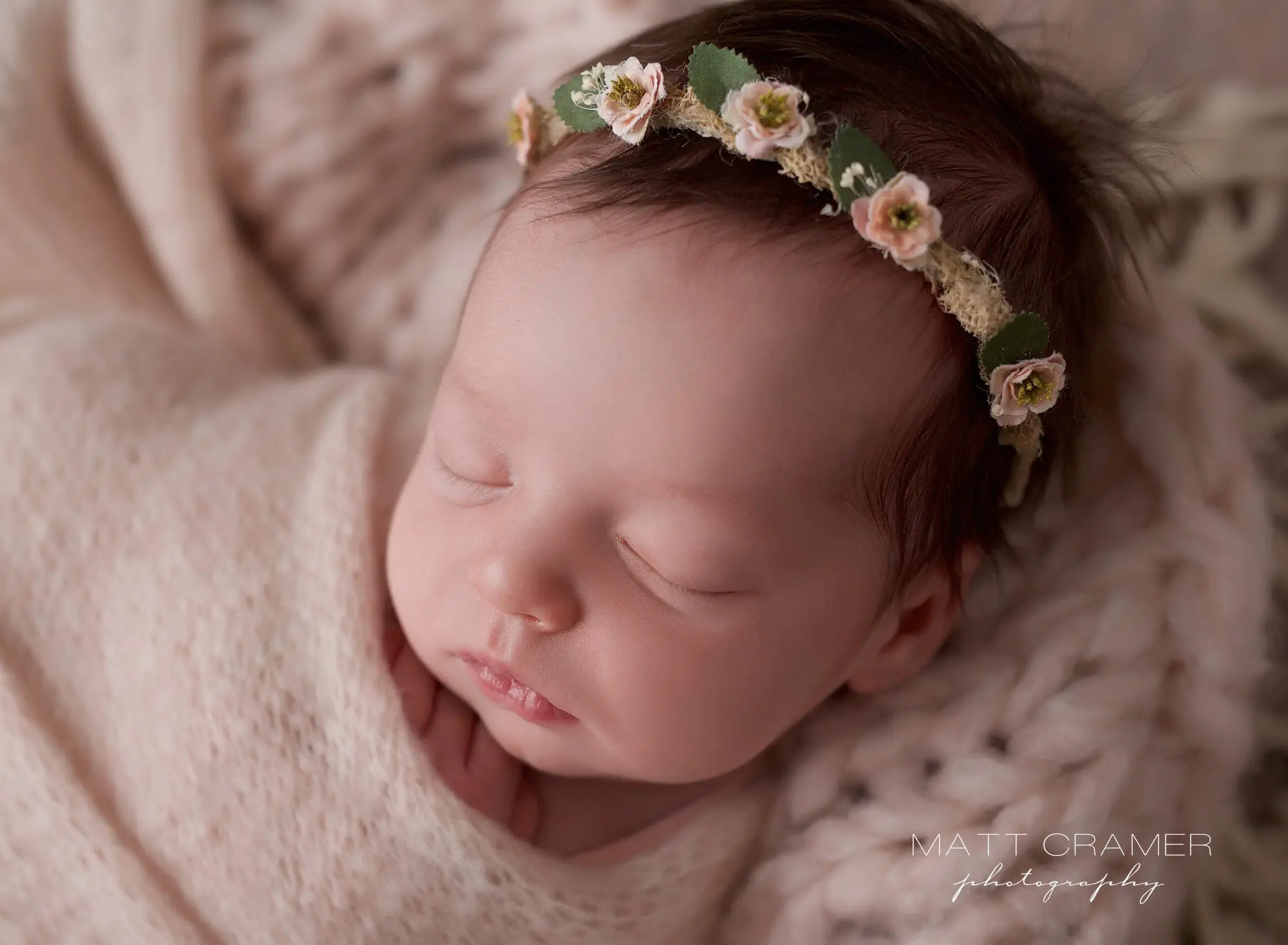 Close-up of her sweet, peaceful face! This delicate floral headband adds such a beautiful touch. She is wrapped up and posed on our newest cashmere swaddle and blanket set. So so soft to the touch!